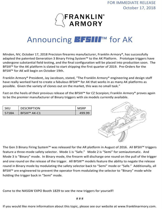 Franklin Armory BFSIII AK-C1 Binary Firing System III Trigger - For most AK platforms | Curved Trigger