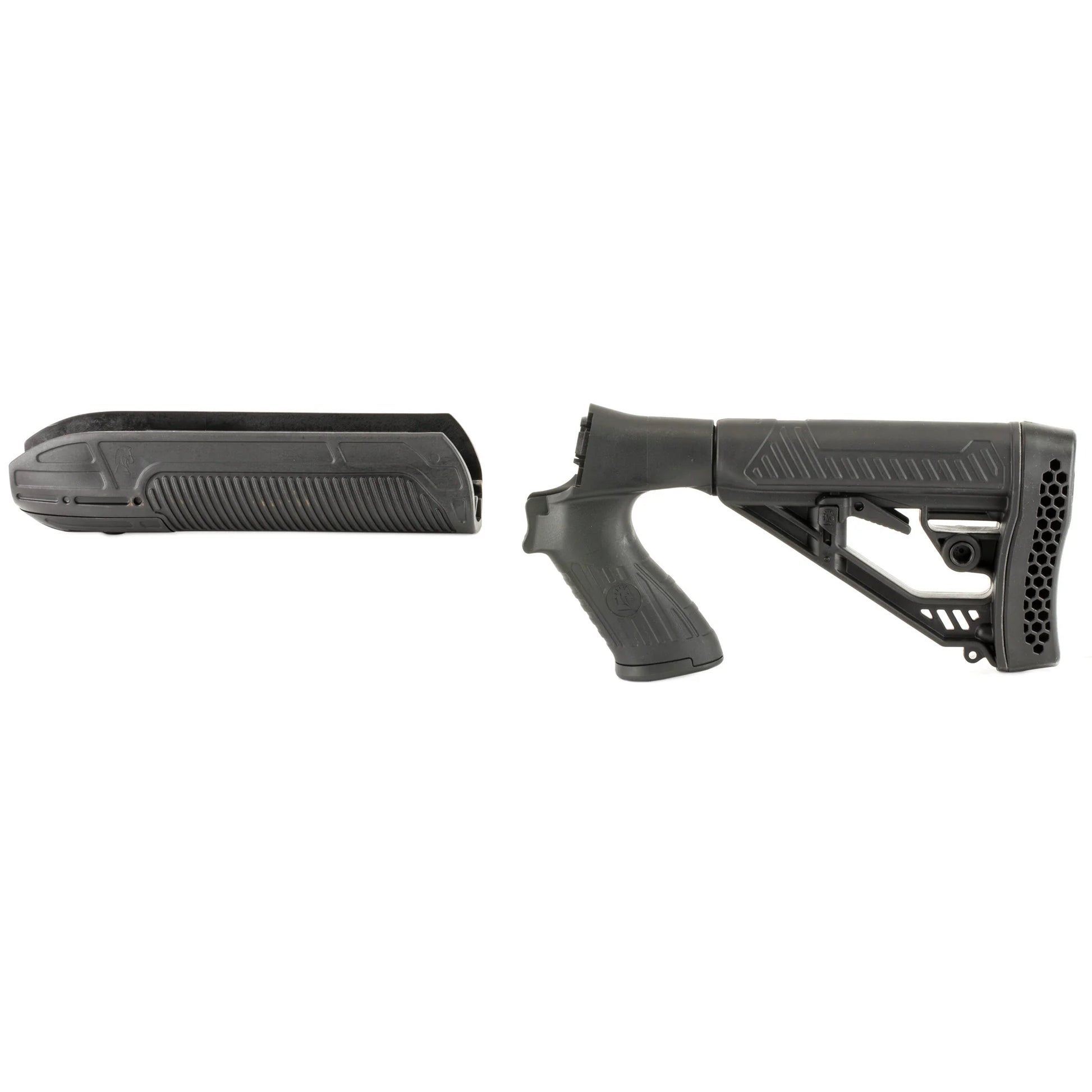 The Adaptive Tactical Forend and M4-Style Stock for Mossberg Shotguns is optimized for pump shotguns. The advanced design features and high-impact polymer construction of the EX Performance Adjustable Stock and Forend make it an ideal choice when upgrading your Mossberg 500 and 590 series 12 gauge pump shotgun.The EX Performance Forend features a 2 inch picatinny rail concealed under the nose cap. Uncovered its ideal for attaching tactical accessories like lasers or lights. The EX Performance M4-style Stock with pistol grip features an easy-to-reach rapid adjust lever for custom length-of-pull, and includes an integrated QD swivel attachment and molded in non-rust standard sling swivel attachment. Durable polymer construction with non-slip vented rubber recoil pad, oversized extra strength adjustment pin and sleek industrial design.