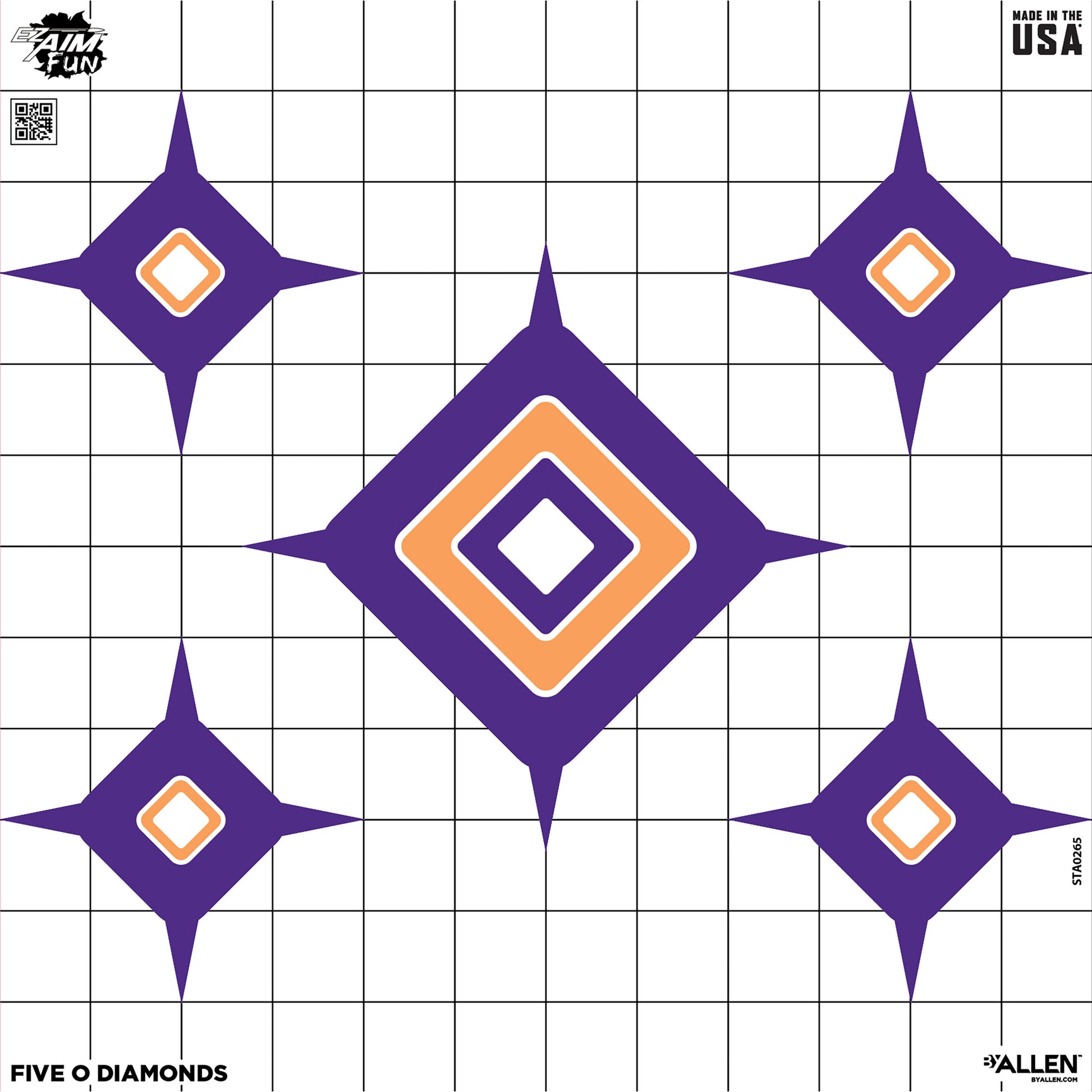 The Allen Ez Aim 12"x12" Dialing In 9pk is designed to enhance the fun and accuracy of target shooting. The pack includes nine targets, each featuring a unique design. These designs include Five-O-Diamonds Targets and Nine Spot Grid Targets, which offer a variety of aiming points and styles. The high-quality paper used ensures that the targets provide a clean cut, allowing for precise judgment of shots. This product is ideal for shooters of all skill levels, from beginners to experts.