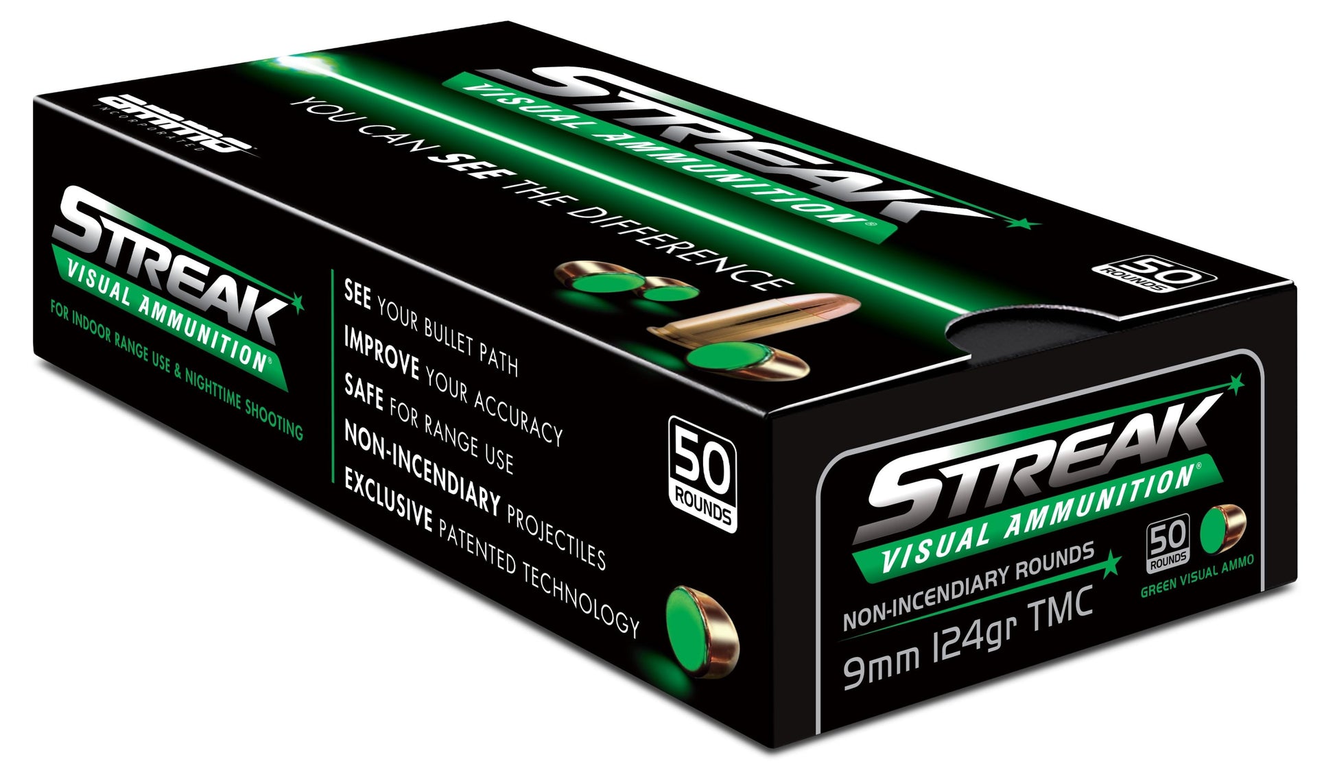STREAK rounds are nonincendiary. They do not generate heat so they are safe to use in environments where tracers are prohibited and can become a serious fire hazard. The results are game-changing in many aspects for the consumer, law enforcement, and military. For indoor range use and low light shooting.
