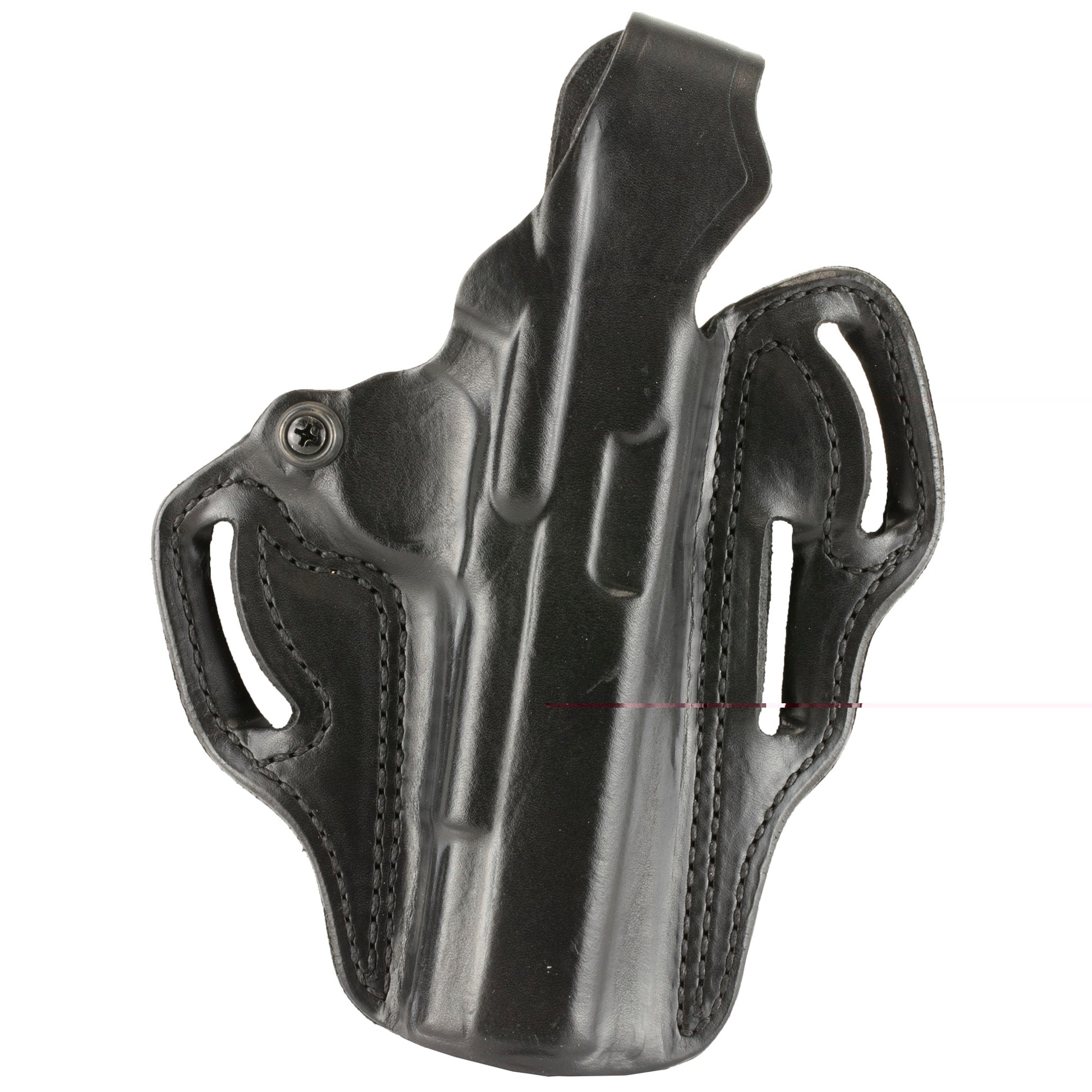 The firearm rides high and is presented at an optimum draw angle. Its thumb break and exact molding, together with a tension device, allows for a secure and highly concealable carry. Belt slots are 1 3/4" wide. Some models with two belt slots and without tension device.