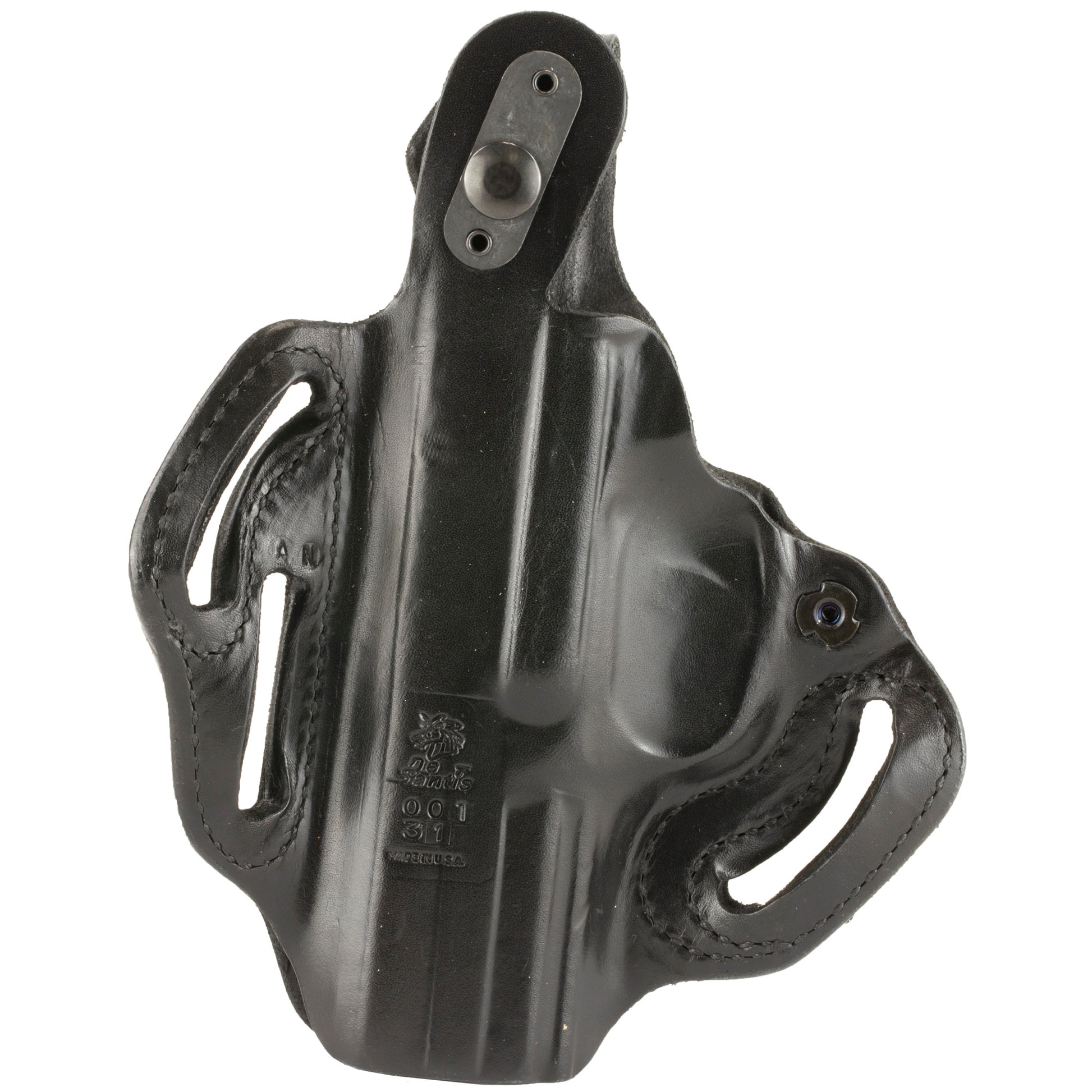 The firearm rides high and is presented at an optimum draw angle. Its thumb break and exact molding, together with a tension device, allows for a secure and highly concealable carry. Belt slots are 1 3/4" wide. Some models with two belt slots and without tension device.