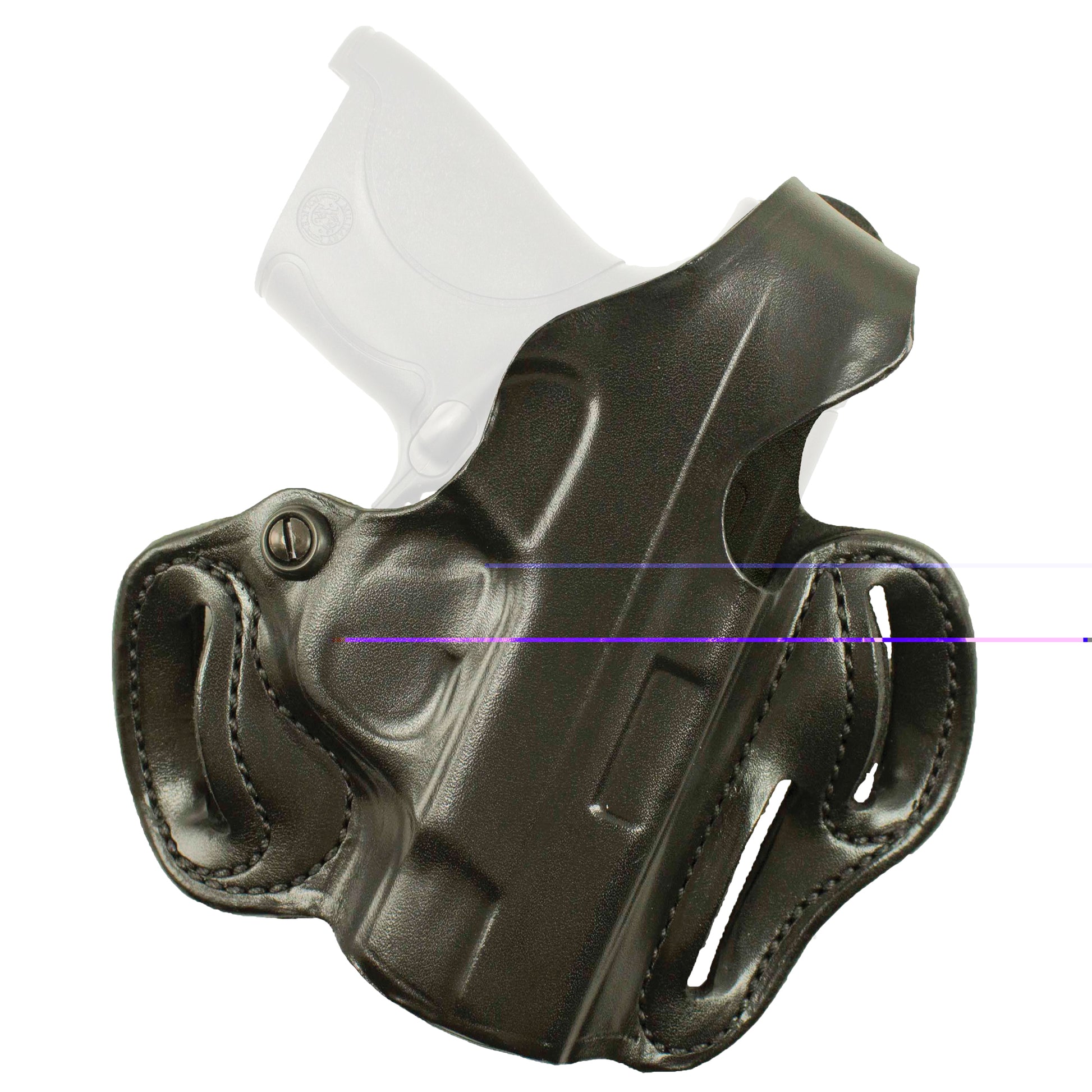 The firearm rides high and is presented at an optimum draw angle. Its thumb break and exact molding, together with a tension device, allows for a secure and highly concealable carry. Belt slots are 1 3/4" wide. Some models with two belt slots and without tension device.