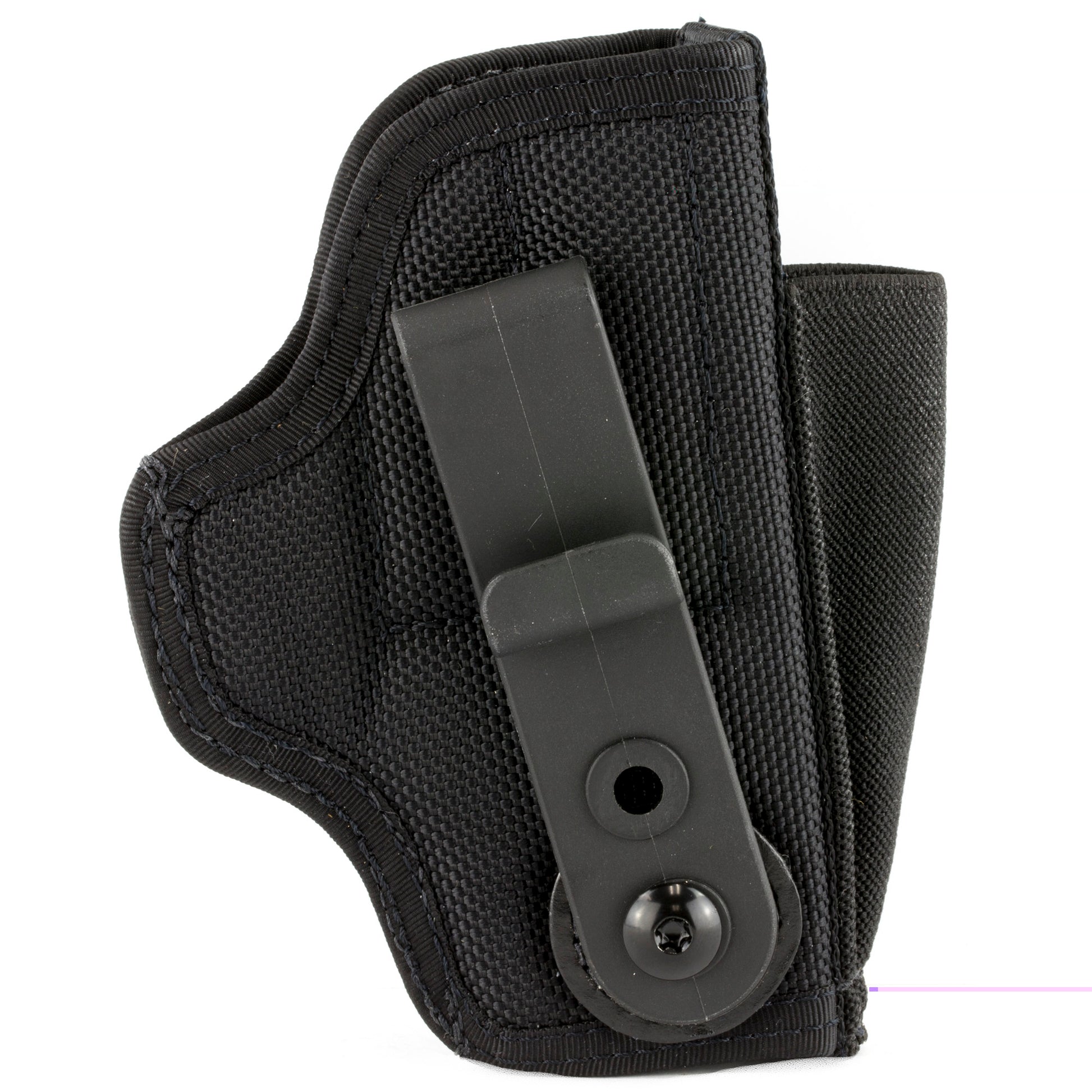 DeSantis Gunhide announces its latest addition in IWB nylon, the #M24 Tuck-This(R) 2. It is built from heavily padded 1050D black Ballistic nylon and lined with slick pack cloth. The widely adjustable belt tab can swing from cross draw to FBI-strong side carry. The tab allows the shirt to be tucked down in between the gun and trousers affording nearly total concealment. Auto-loader versions of the Tuck-This(R) 2 will have a magazine pouch built into the front holster spine. The M24 is currently made for most concealable hand guns in both right and left-hand versions. DeSantis made the original Tuck-able in the early seventies and cataloged it as the IA holster. Accommodates belts up to 1 3/4" wide. Available in black.