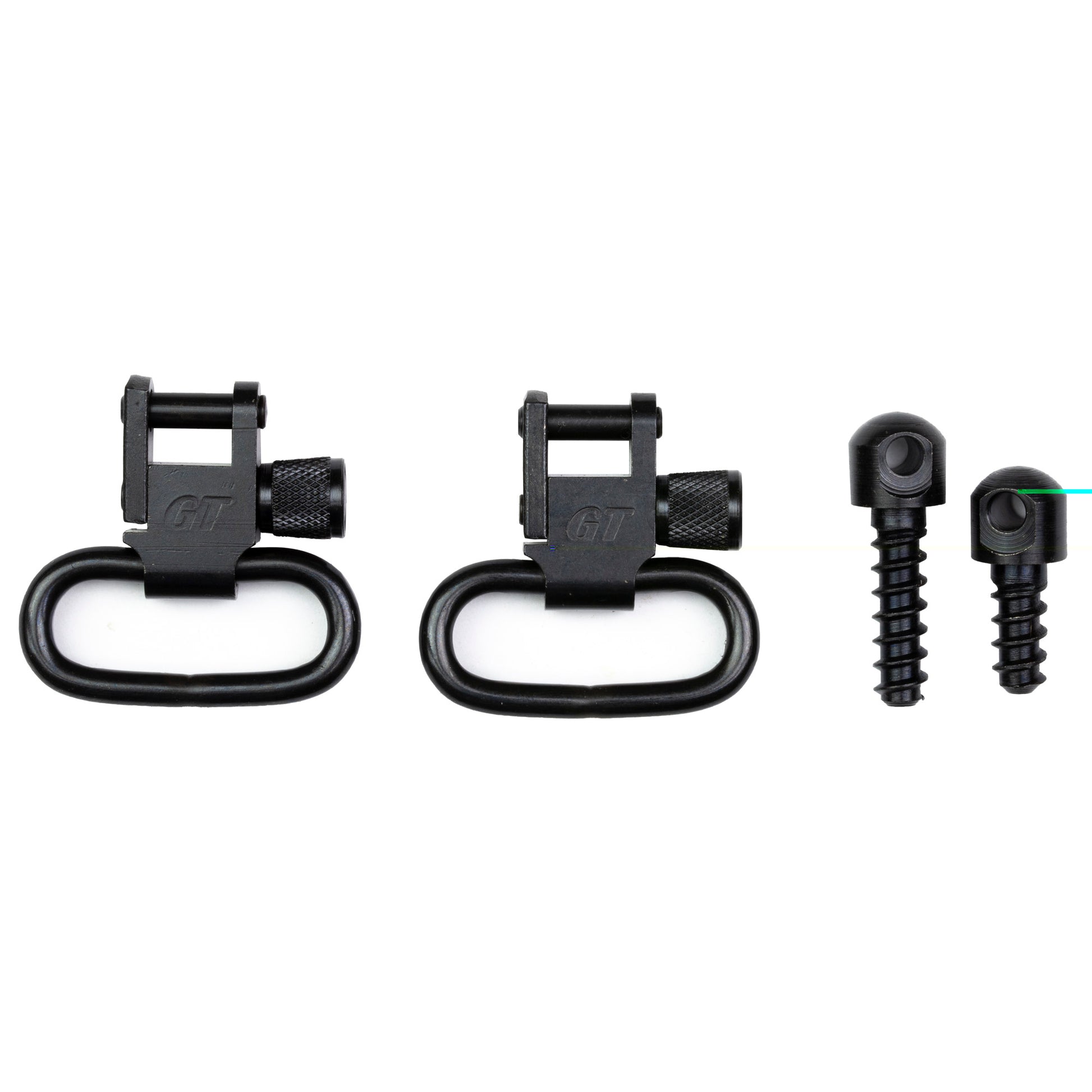 The set includes a pair of GT Locking Swivels that securely attach to the mounting stud. The swivels lock down with a knurled cylinder nut, preventing accidental detachment and ensuring a strong connection.