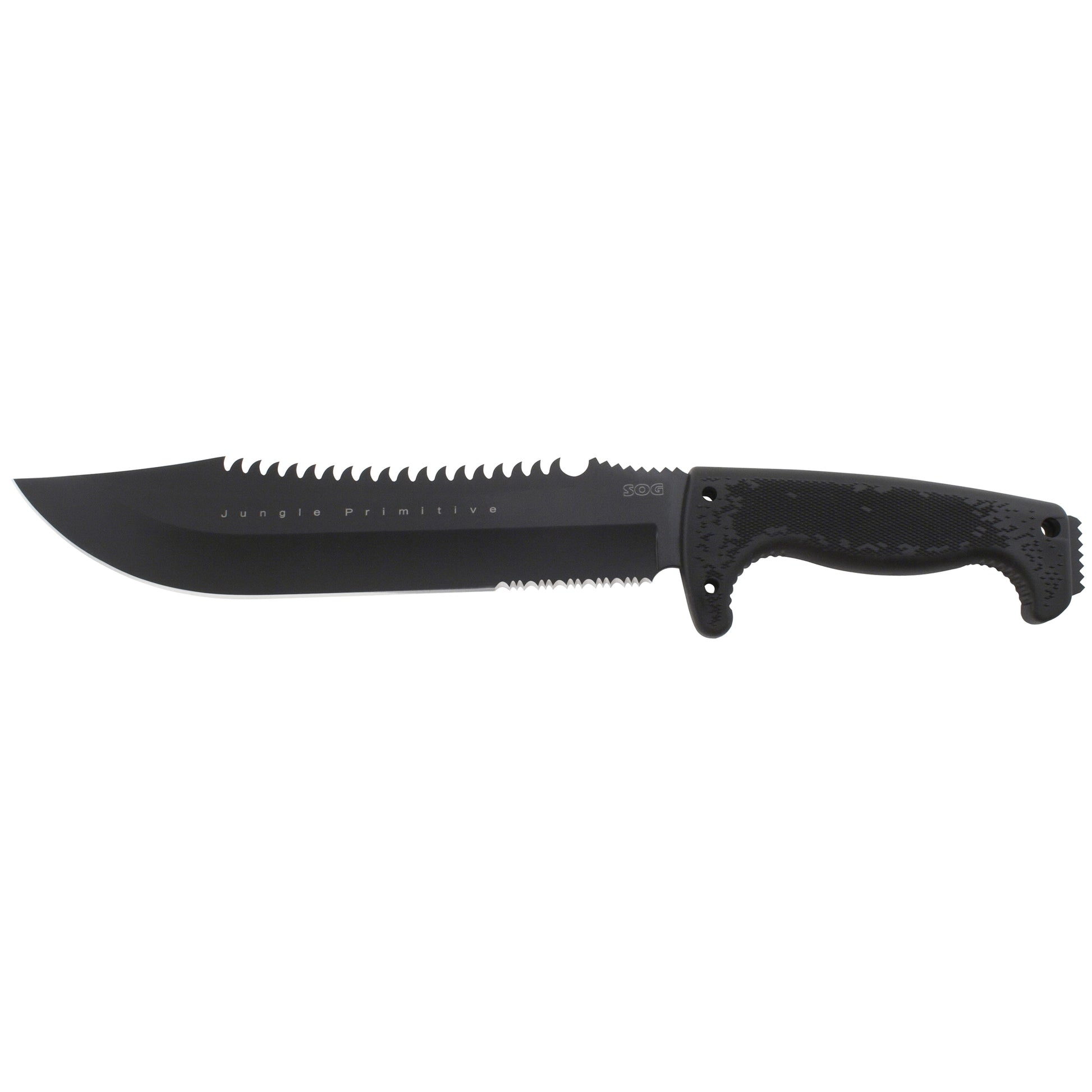 For the primitive in all of us. When the only thing that separates you from them is your equipment, it better be good. Using SOGs Hardcased black coating, the Jungle Primitive is durable and comfortable with a molded Kraton handle that features Digi-Grip, a way to guarantee gripping power where you need it. One can instantly turn the Primitive into a small machete, limb saw, or hammer. Includes a Nylon sheath with utility pouch. Dont be caught alone!