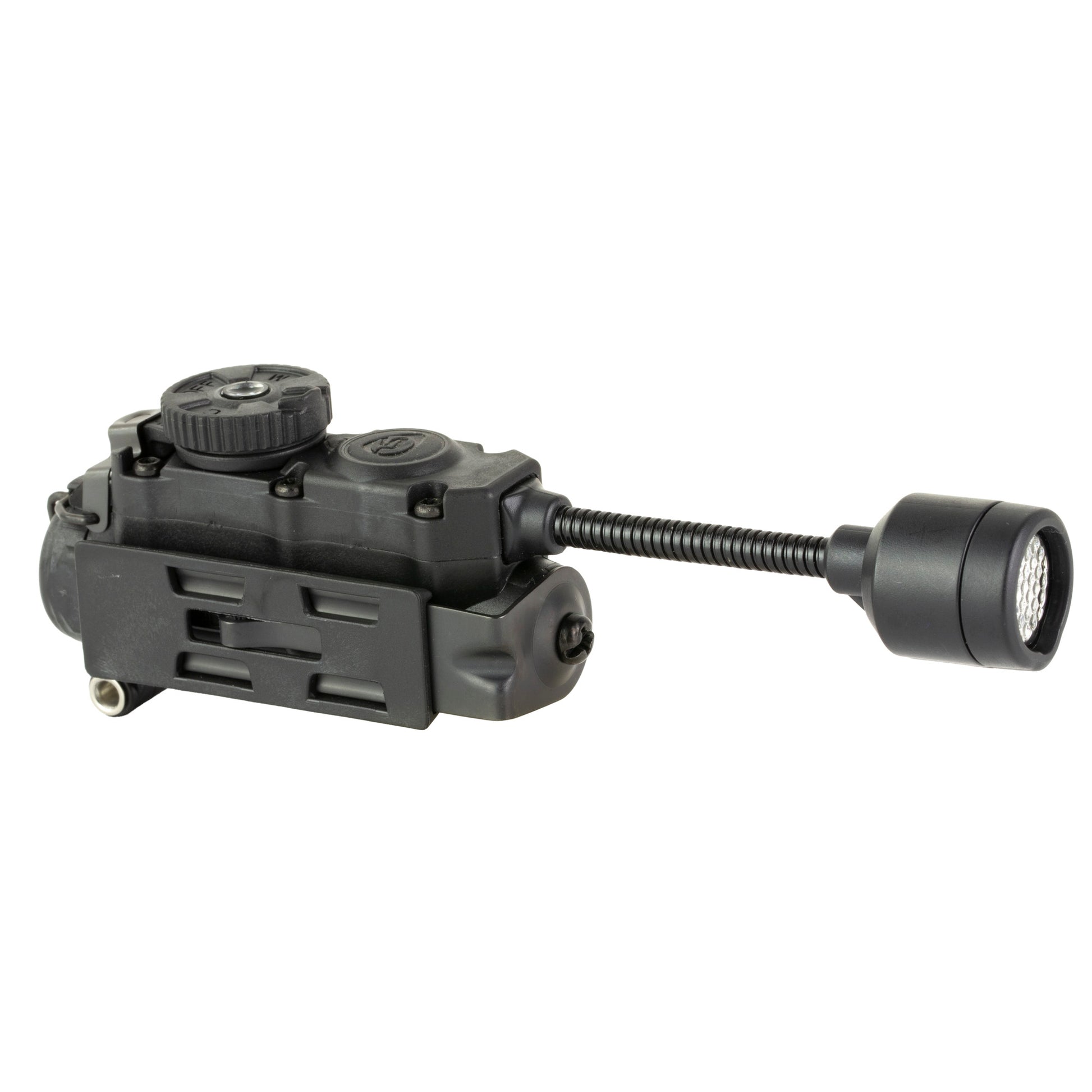 Designed to minimize the number of illuminators an operator must carry, the low-profile Sidewinder Stalk provides ultimate maneuverability, multiple mounting options, and a flexible stalk to aim the beam. Multi-fuel capability allows it to accept more than one battery type. Features visible white, multi-colored, and IR LEDs. In addition, a separate Identification Friend or Foe (IFF) switch lets you use both the main light and IFF when needed.