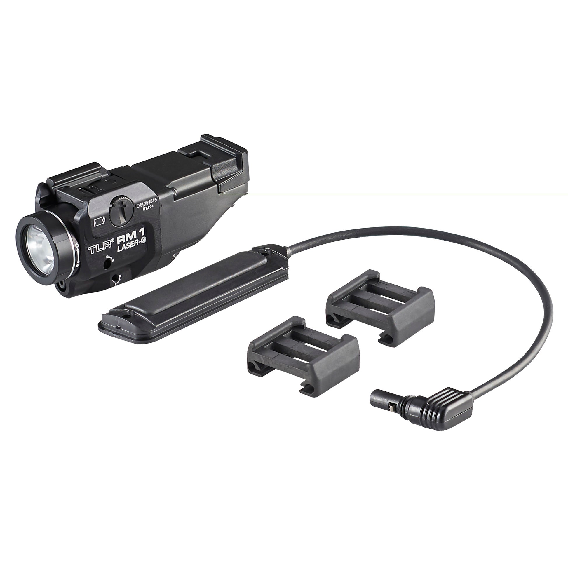 The Streamlight TLR RM 1 Green Laser Tactical Long Gun Light produces 500 lumens with 140-meter beam distance. The kit offers independently operating push-button and remote pressure switch options. This light will last 1.5 hours on the one CR123A battery that is included.