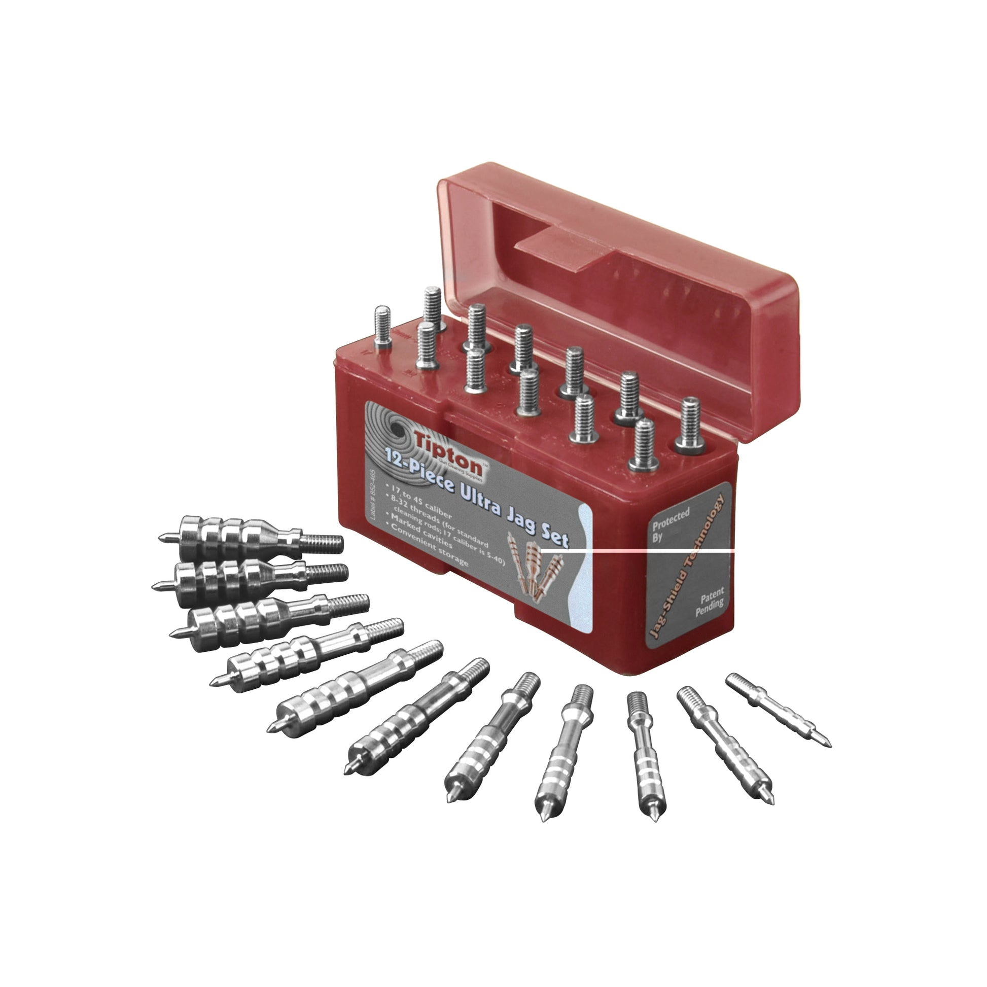 Contained in a durable, hinged box with marked cavities, its easy to select the correct Ultra Jag(TM) for your particular application. Because they are caliber-specific, you can be assured of an optimum fit to your firearms bore for efficient and thorough cleaning. 17 to 45 caliber