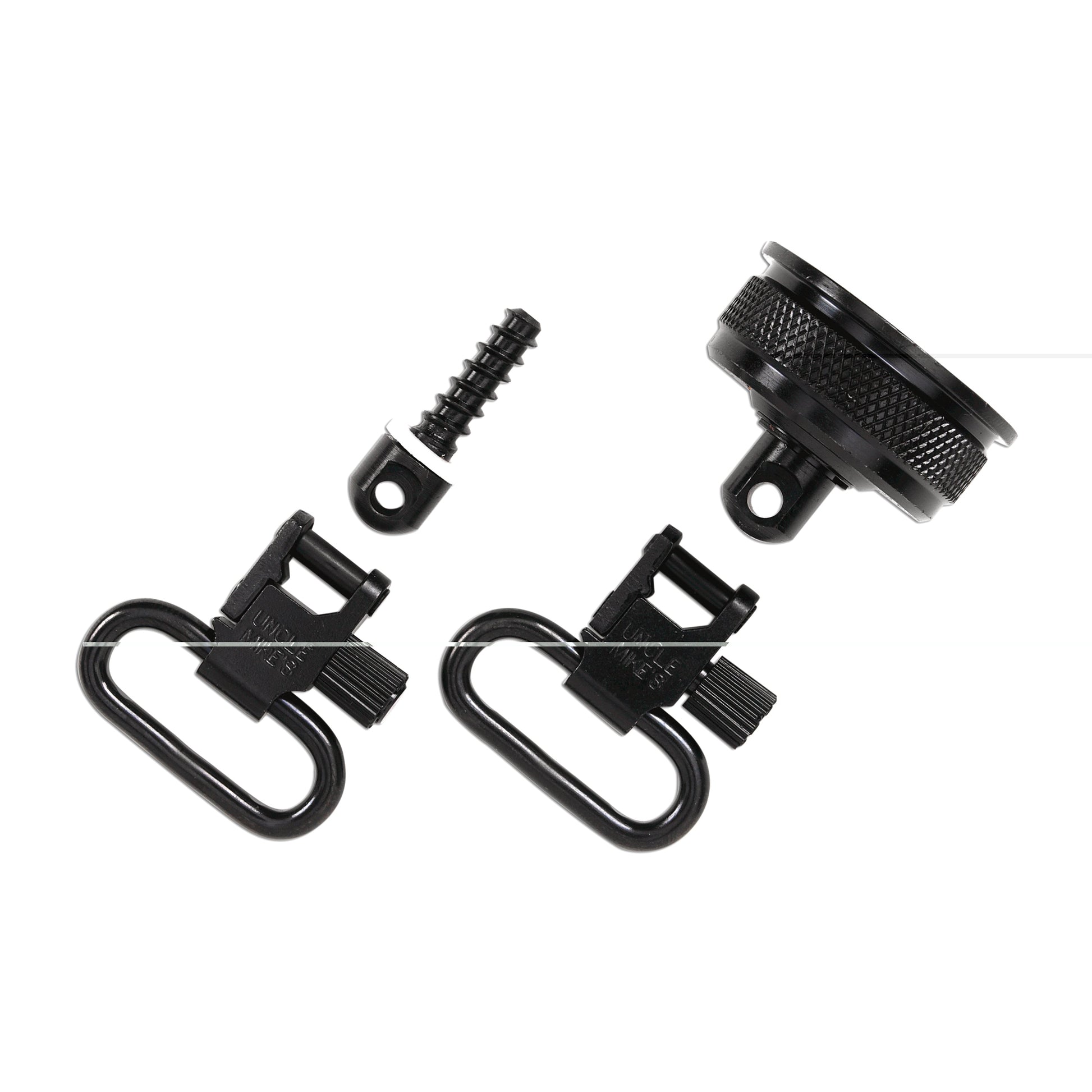 Remington 870 replacement magazine cap with swivel base, 3/4" wood screw butt-stock swivel base and two Super Swivels.